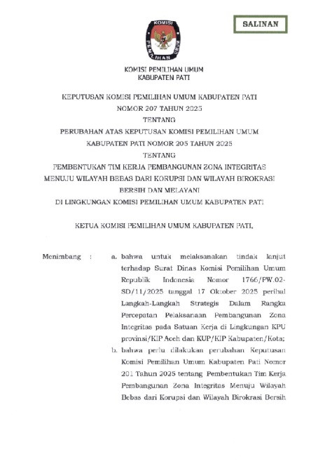 SK NO 207 TAHUN 2025 TENTANG PEMBENTUKAN TIM KERJA PEMBANGUNAN ZI MENUJU WILAYAH BEBAS DARI KORUPSI DAN WILAYAH BIROKRASI BERSIH DAN MELAYANI DI LINGKUNGAN KOMISI PEMILIHAN UMUM KABUPATEN PATI